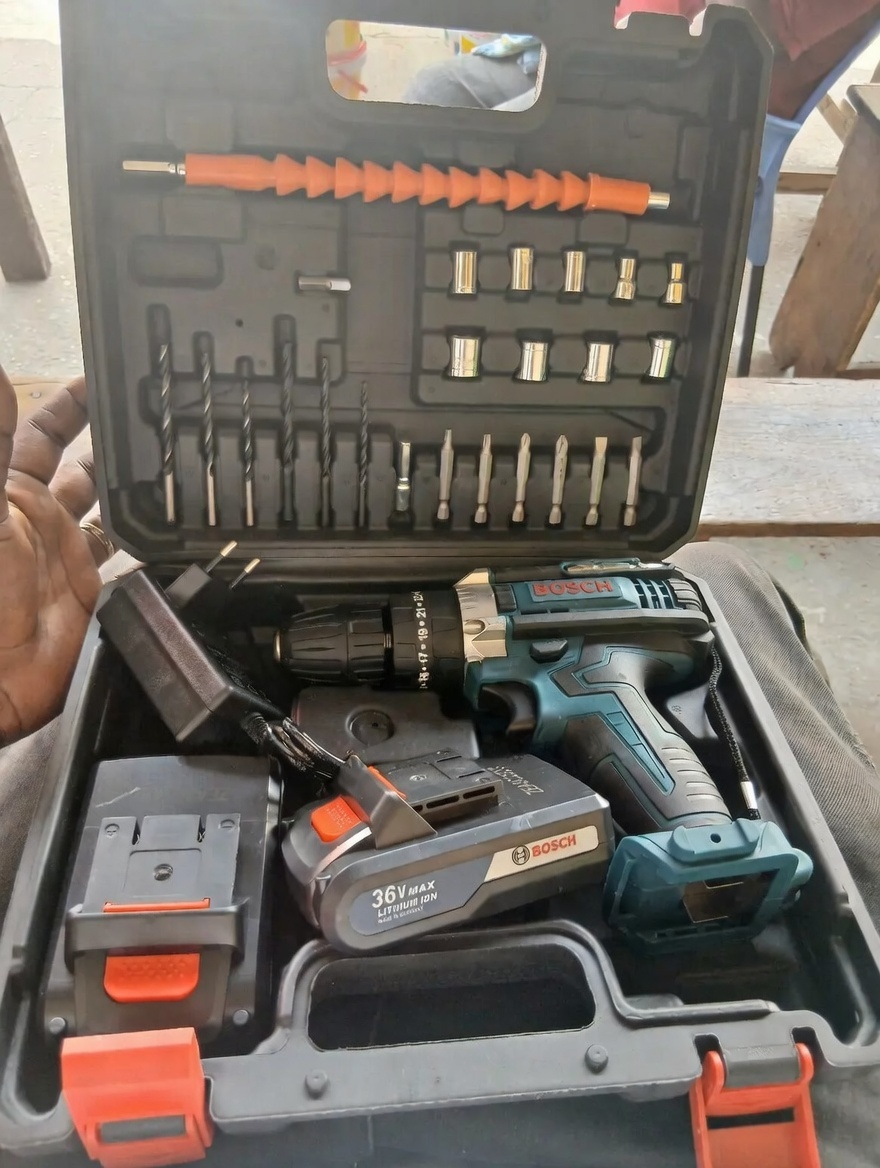 A rechargeable drill machine with a high volume of 36mx, it has a volt of 200v – 240v. It comes in it own suit case containing all sizes of drill bits comes with own charger and adaoptor.